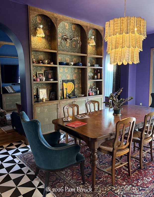 Let’s start in the heart of the home: a purple-walled dining room with William Morris wallpaper backing built-in shelving. It’s the same wallpaper, in a different colorway, as in the Studio Burgoon powder bath. It’s interesting to see which particular design elements pop up in multiple houses on the tour.