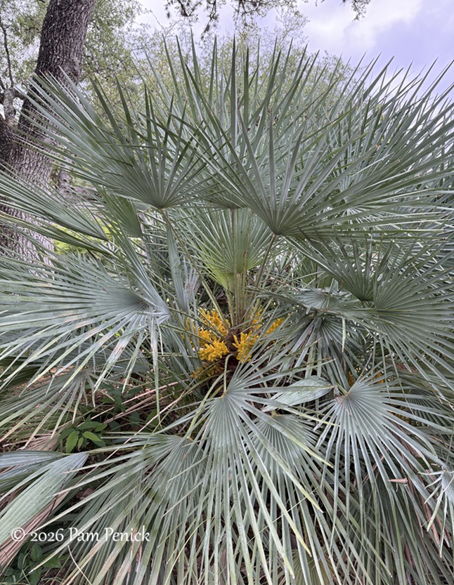 When the silver Mediterranean fan palm (Chamaerops humilis var. argentea) starts blooming, its Cheeto-like panicles seem to glow amid the frosty fronds.
